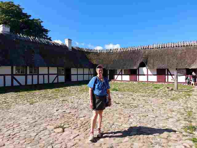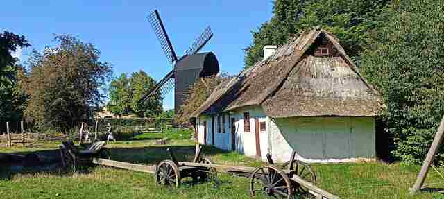Skansen FrilandsMuseet szalenie nam się podobał. Kilkadziesiąt chałup, pojedynczych lub ułożonych w zespoły kilku domów na planie kwadratu. Niektóre z charakterystycznym pruskim murem. Niby jak u nas, ale z większą przestrzenią i bogatszym wnętrzem. Chaty są kryte np. gontem. Były też dwa wiatraki i tradycyjny młyn nad stawkiem.