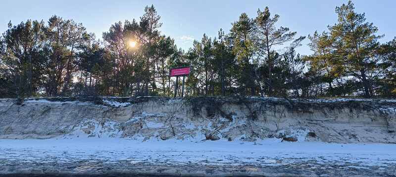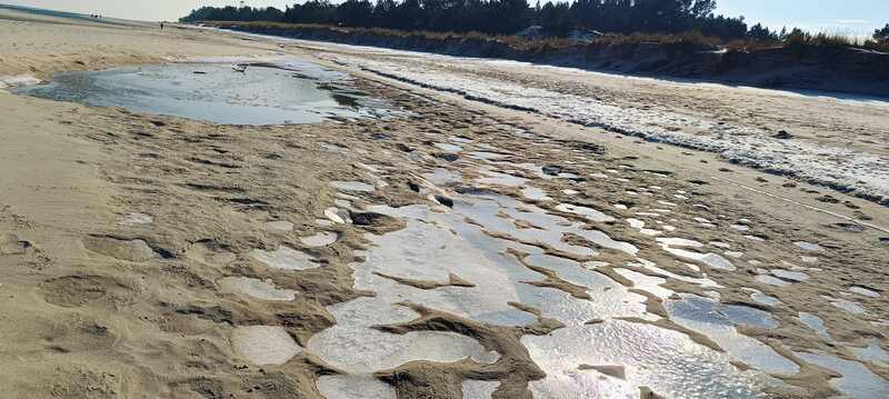 Co kilkaset metrów woda wpadła na plotki na ląd, ale już nie miała siły wrócić. Dlatego tworzy w zagłębieniach piasku kilkumetrowe lekko zamarznięte kałuże lub ich ciągi.