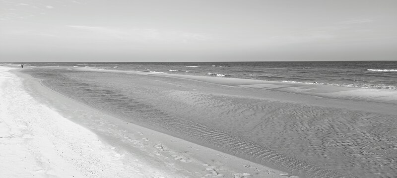 – Bór, to jeszcze kawał drogi. Jakieś 2-3 km – mówi mijana dziewczyna. No dobra, idę dalej. W pewnym momencie między drzewami na wydmie widzę rozwieszony duży, kolorowy hamak. Ktoś korzysta z chwili kołysania na nim. Błogo. W pewnym momencie plaża zwęża się. Piasek jest lekko czarny.
