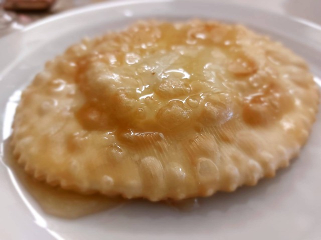 Szczupła brunetka po 50 – tce poleciła mi makaron z mięsem i sosem Ragu a Romkowi PaneFrattau, czyli sardyński chleb namaczany w bulionie, posypany serem a na górze z jajkiem w koszulce. Na deser coś na słodko – słono, czyli Seadas. Jest to pieróg z słonym stopionym serem i polanym miodem.