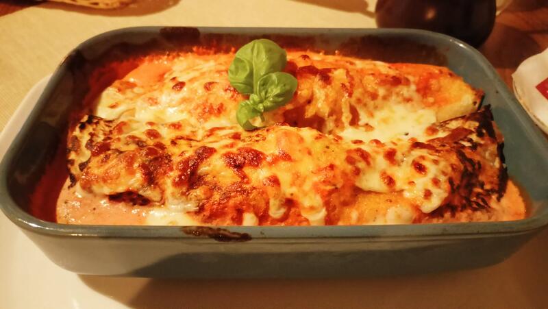 🥞 Przykładowe naleśniki z brakułami, kurczakiem, warzywami, zapiekane z serem i sosem są smaczne, choć jak dla mnie za mało doprawione.