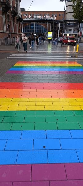 Pierwszego dnia pojechałyśmy do Den Bosch, które oddalone jest jakieś 20 -25 minut jazdy intercity od Eindhoven. Uznawane bywa za jedno z najstarszych w kraju. „Kłócą” się o to jeszcze Maastricht i Haarlem. Do centrum prowadzą nas dwa rzędy kamienic, po lewej i prawej stronie. Przechodzimy tęczowe pasy, co Małgorzata skomentuje : „U nas, by już to farbą zalali pewni smutni panowie…”