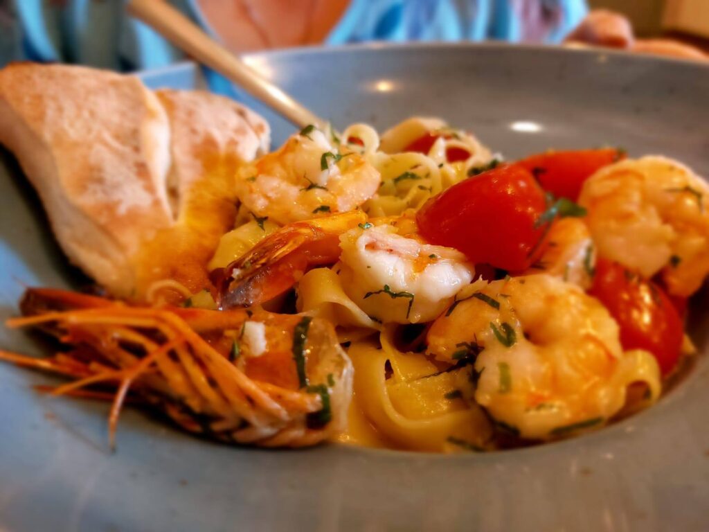 Bardzo dobre, choć mnie zasmakowało z dodatkiem oliwy z czosnkiem i odrobioną pieprzu. Krewetki były idealne. Delikatnie twarde o nie zaburzonym niczym naturalnym smaku.