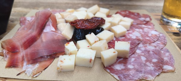 Zamówiliśmy u niego deskę z serami i wędlinami ( mała 6 euro, średnia 12 euro) . Niezłe sery od ostrego po słodki, od miękkiego po twardy. Wędliny pokrojone są tak cieniutko, że przez warstwy tłuszczu widać świat. Niezłe, wyraźne w smaku. Tutejsze delikatesy. Gdybym tylko zamiast ginu z whisky otrzymała zamówione mohito, to świat mniej przypominałby kołyszącą łajbę. A tak serio , to nie jest źle.