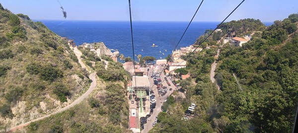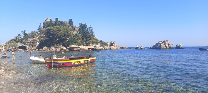 Będąc w Taorminie można skorzystać z objazdu autobusem „hop on hop off”, wypożyczyć skuter lub z plaży łódkami popływać po kilku zatokach. Rejsy kosztują od 15 euro od osoby, za dwójkę stówa. Czas kursu waha się od 45-60 minut. Aby dostać się do sterników, zjechaliśmy kolejką do kolejnej miejscowości o nazwie Mazarro. Wagoniki są 4 i każdy pomieści 12 osób, ale trzeba w nich stać. Jedzie się kilka minut. Kosztuje to 6 euro w jedną stronę. Bilet w obie tańszy jest o 2 euro.